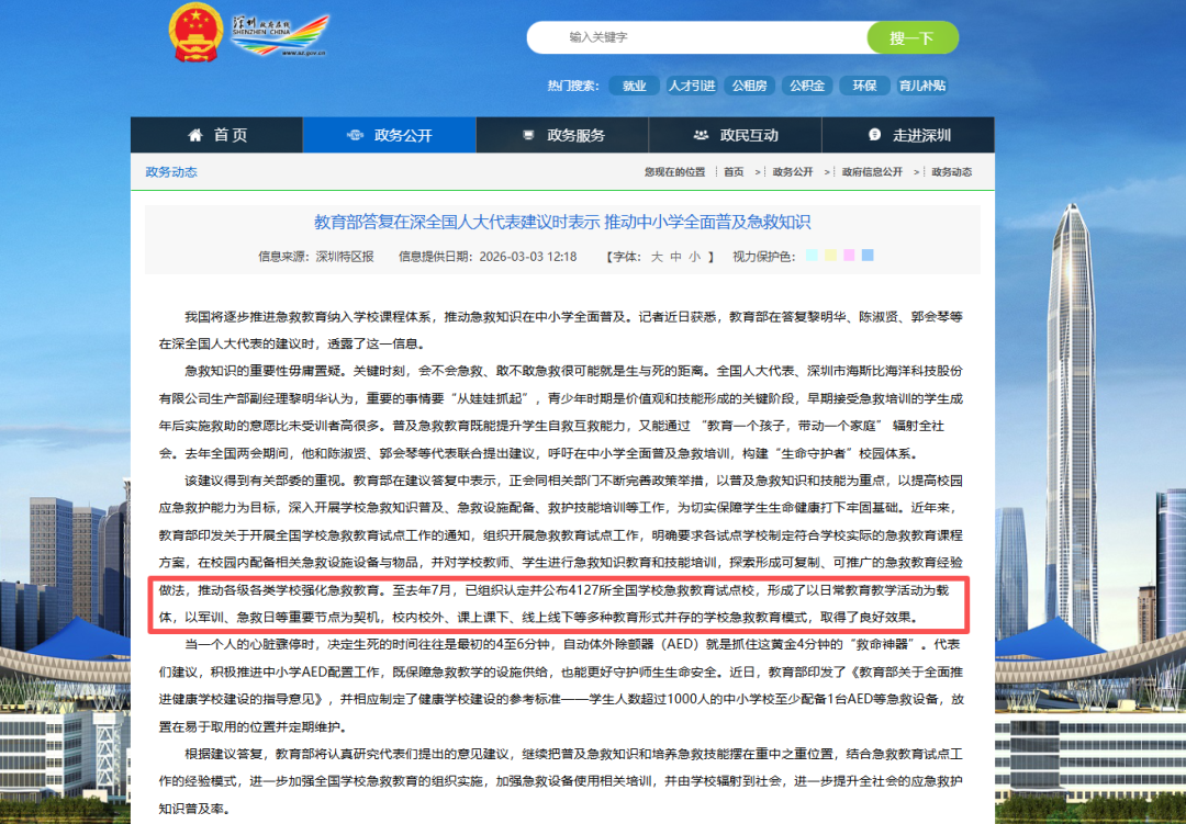 深圳:全国人大代表连续多年呼吁中小学普及AED,教育部答复“推动急救知识纳入课程体系”,已认定公布4127所全国学校急救教育试点校。