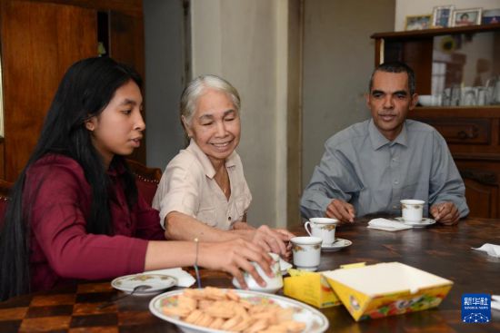 8月12日,在马达加斯加塔那那利佛,彦琳(左一)和奶奶蒙丽嫦(右二)、爸爸弗朗西斯·马尔松(右一)在家中聊天。新华社发(西塔卡·拉乔纳里松摄)