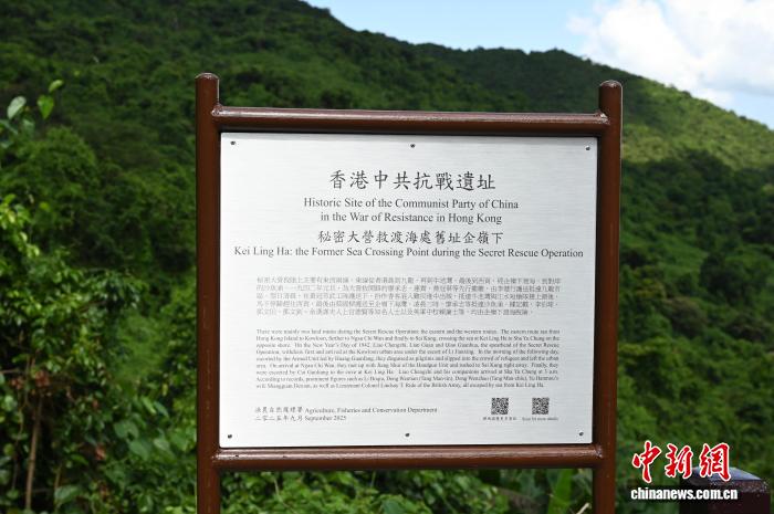 9月5日,香港特区政府渔农自然护理署在马鞍山郊野公园西贡企岭下西沙路举行香港中共抗战遗址纪念牌匾揭牌仪式。图为香港新界西贡企岭下西沙路的香港中共抗战遗址“秘密大营救渡海处旧址企岭下”牌匾。中新社记者 李志华 摄