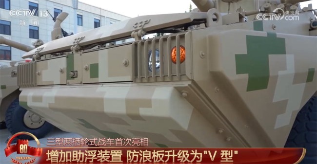展示的三型两栖轮式战车在外观上有所变化,最显著的是增加了助浮装置,这种装置配备多块浮箱,可以有效提升装备浮力,确保海上航行安全。此外,防浪板也从“平板式”升级为“V型”,提高了抗浪强度。