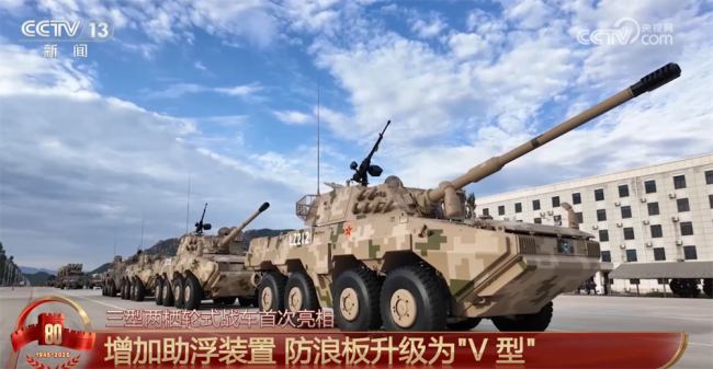 两栖突击方队的宋栋介绍,此次受阅的三型装备包括两栖轮式装甲突击车、两栖轮式步兵战车以及两栖轮式自行榴炮车,这些装备主要用于执行两栖登陆作战和快速夺要等多样化军事任务。这些装备提升了轮式装甲装备由水至岸快速机动的能力。