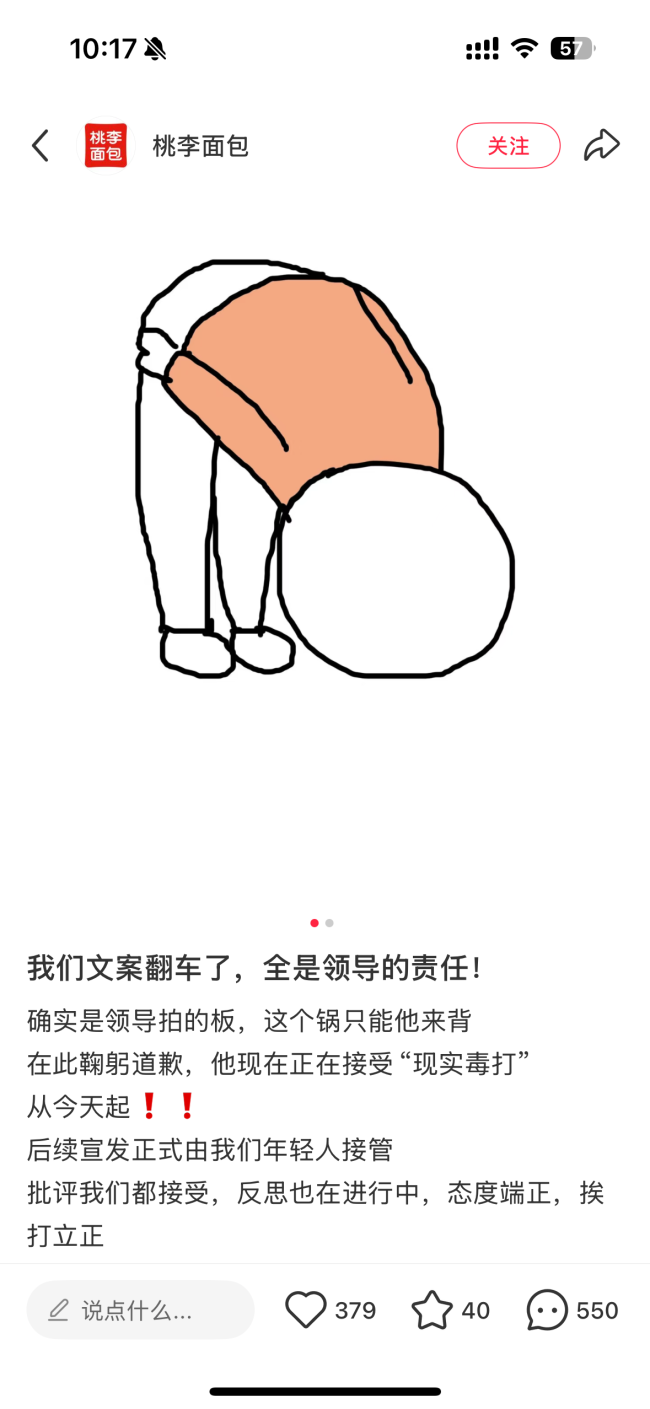 9月5日,桃李面包还在社交平台发文道歉称:“我们文案翻车了,全是领导的责任!确实是领导拍的板,这个锅只能他来背。在此鞠躬道歉,他现在正在接受现实毒打。后续宣发正式由我们年轻人接管。批评我们都接受,反思也在进行中,态度端正,挨打立正。”