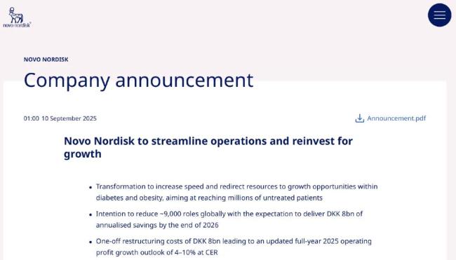 9月10日,诺和诺德官网发布消息称,将进行全公司范围的转型。作为转型的一部分,诺和诺德计划在全球减员约9000人,其中丹麦预计占5000人。