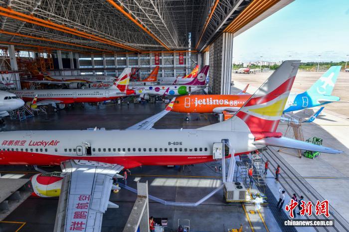 图为多架进境维修飞机正在海南自贸港一站式飞机维修产业基地内进行全面检修。中新网记者 骆云飞 摄
