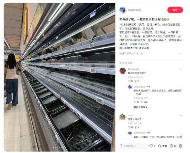 超强台风“桦加沙”即将强势登陆,为了应对可能带来的影响,市民们纷纷前往超市抢购物资。22日有深圳市民发帖称,早上7点多到沃尔玛,发现蔬菜、面包、熟食、鲜肉区都被搬空了,最终空手而归。还有市民晒出“扫货囤粮”的照片,不仅有果蔬蛋奶肉,还有蜡烛。广东广播电视台报道,深圳有商超部分货架已清空,只有辣椒被剩下,相关话题登上热搜。
