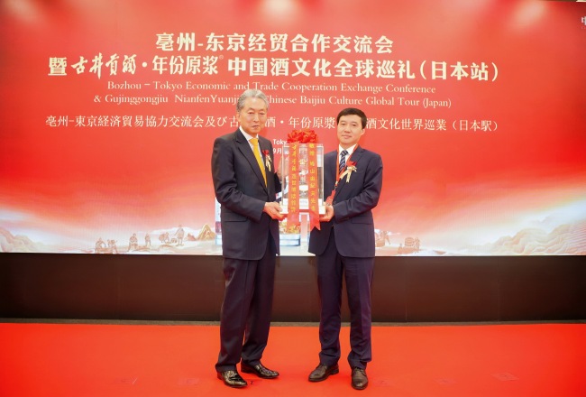 图丨亳州市委常委、副市长钟治峰向鸠山由纪夫先生赠送年份原浆纪念酒