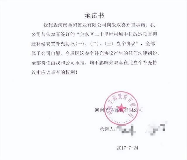 2017年7月17日,开发商河南圣鸿置业有限公司工作人员来到朱双喜家里,在当地政府工作人员见证下,他们签订了《搬迁补偿安置补充协议》。同年7月24日,圣鸿公司给他出具了“承诺书”,称与朱双喜签订的3份补充协议全部属于公司自愿,今后因这3份补充协议产生的任何法律纠纷,责任由公司承担,不影响朱双喜的权利。接下来两天,圣鸿公司分两次支付了协议约定的1300余万元拆迁补偿款。