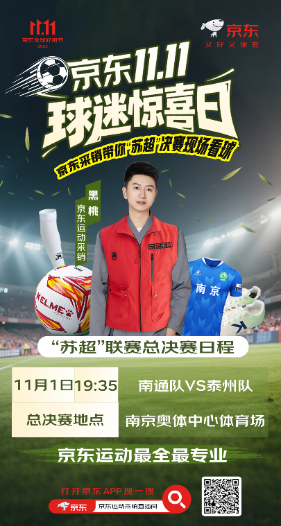 随着江苏省城市足球联赛(以下简称“苏超”)决赛拉开帷幕,作为赛事官方战略合作伙伴,京东11.11特别打造“球迷惊喜日”,通过多重福利活动,为球迷带来一场沉浸式的观赛体验。11月1日当天,用户不仅可进入京东运动采销直播间,实时观看“苏超”总决赛的激烈对决,还能在会场1元竞拍库里、刘诗雯、林高远等众多球星的亲签珍品,领取运动199减50大额券,免费抽取“苏超”周边大礼包、PLUS会员卡等,更有万件球类装备低至5折。打开京东APP搜索“运动球迷惊喜日”,一键加入这场专属于球迷的狂欢!