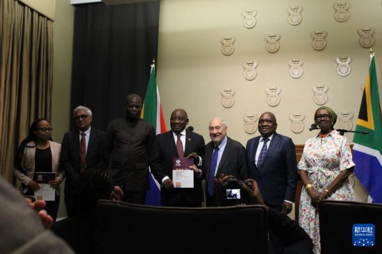 11月4日,在南非立法首都开普敦,二十国集团应对全球不平等问题特别独立专家委员会主席、诺贝尔经济学奖得主约瑟夫·施蒂格利茨(右)向南非总统拉马福萨提交关于全球不平等问题的报告。新华社发(沙姬拉·泰比摄)