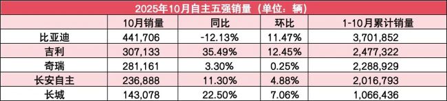 比亚迪依然稳居第一。10月,比亚迪销量为441706辆,同比下降12%,环比增长11.47%,创年内销量新高。不过同比来看还是下降了12%,这也是比亚迪连续第二个月销量同比下滑。去年同期,比亚迪单月销量达到了50万辆。虽然比亚迪规模仍然稳居第一,但销量增速已经明显放缓或下滑。今年1-10月,比亚迪累计销量为3701852辆。如果比亚迪在接下来两个月稳定在45万辆左右水平,今年全年销量将会达到450万辆。