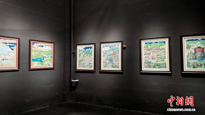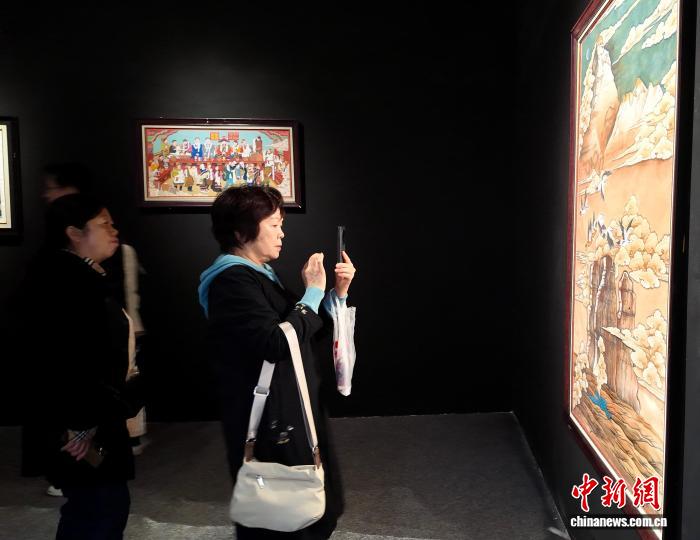图为参观者拍摄展览现场绘制唐卡的画师。何美锟 摄