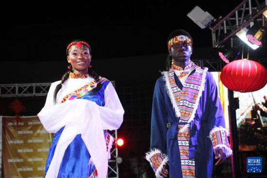 11月8日,在贝宁经济首都科托努举行的“中国贝宁服装秀”活动中,阿波美卡拉维大学孔子学院学生在穿戴中国传统服饰。新华社发(塞拉芬摄)