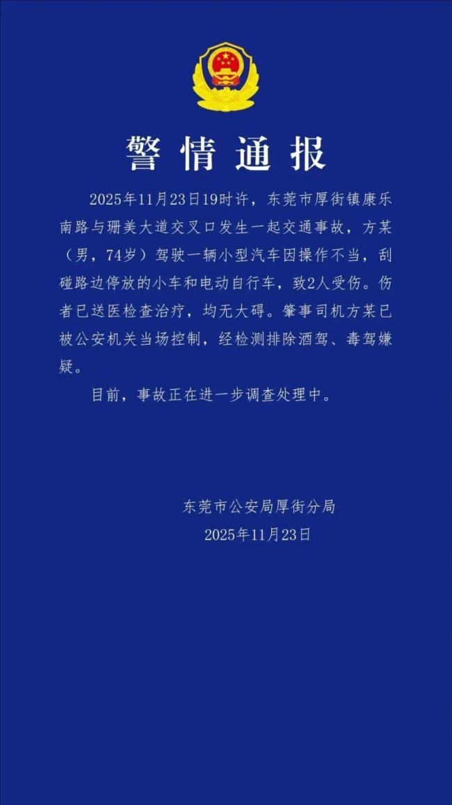 11月23日晚,广东省东莞市公安局厚街分局通报了一起交通事故。当天19时许,在东莞市厚街镇康乐南路与珊美大道交叉口,一名74岁的男性驾驶员方某因操作不当,导致其驾驶的小型汽车刮碰了路边停放的几辆小车和电动自行车,事故造成两人受伤。