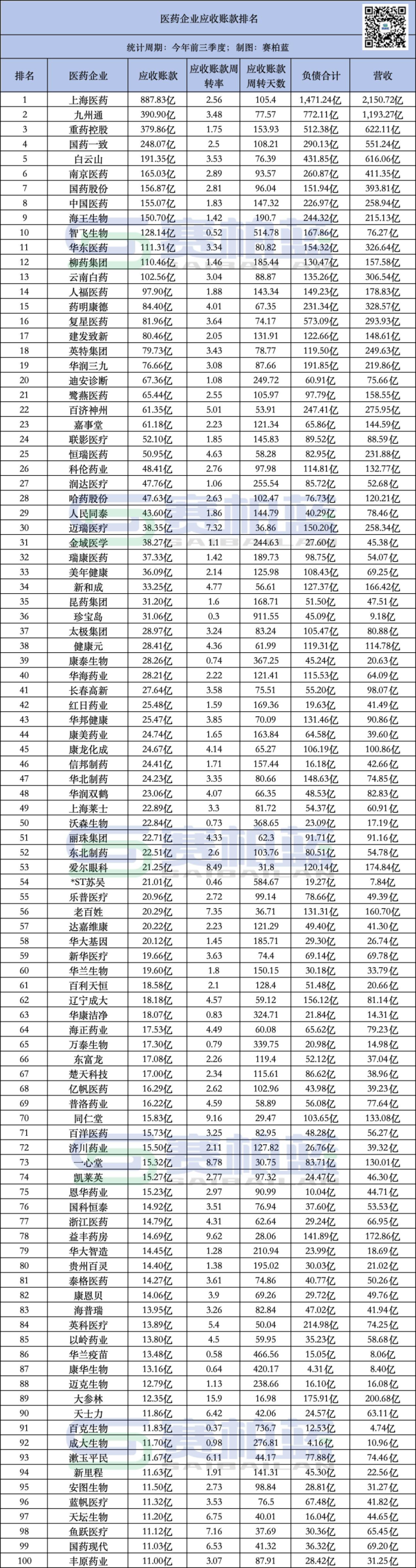 应收账款前十医药企业最大差值7倍 有企业账款回收周期超6年