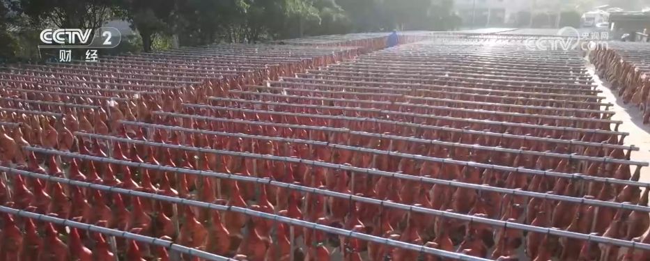 如今,晒火腿也成为金华冬日的一道靓丽风景。在这家百年火腿厂,数万只形如琵琶的火腿整齐悬挂,工人们穿梭其间,为火腿进行翻晒、塑形,确保每只火腿都能均匀接受阳光的洗礼。