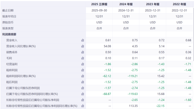 拆单季度看,2025Q3,公司实现收入为2544万美元,同比增长72.0%,环比增长18.6%,净利润为-6132万美元,2024Q3为-4189万美元,2025Q2为-5310万美元。