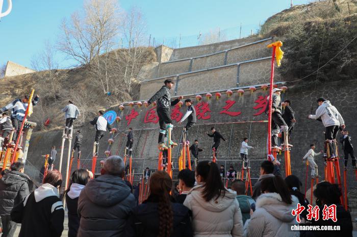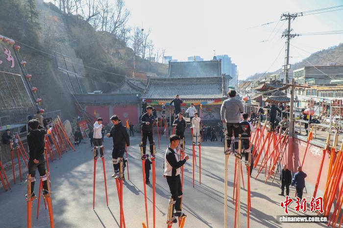 1月22日,青海湟中,返乡大学生和“10后”青少年参与传统社火高跷排练。随着马年春节脚步临近,青海基层组织的文艺表演也进入紧张排练中。中新社记者 马铭言 摄