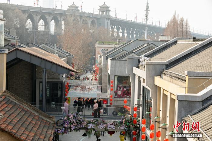 2月12日,湖北武汉,春节将至,武昌古城斗级营街区张灯结彩,处处洋溢着喜庆祥和的节日氛围。街区精心打造“抬头见黄鹤楼”的特色打卡场景,还可与武汉长江大桥同框,吸引大批市民游客前来打卡游玩。图为游客在武昌斗级营街区游玩。中新社记者 张畅 摄