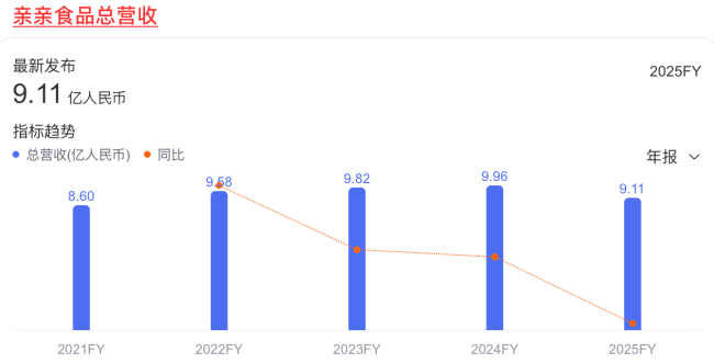 但财报显示,2021年至2025年,亲亲食品的营收分别为8.6亿元、9.58亿元、9.82亿元、9.96亿元和9.11亿元,始终未能重新突破10亿元大关。