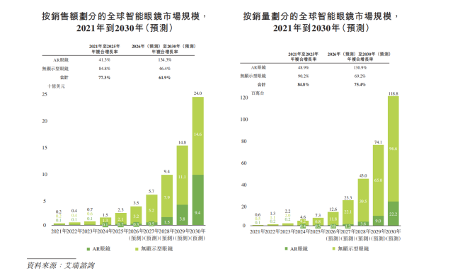 XREAL顶着亏损前行,赌的是智能眼镜赛道的未来。据艾瑞咨询数据,2025年全球智能眼镜市场规模约23亿美元,预计2030年将增至约240亿美元,其中AR眼镜兼具日常佩戴的便捷性和沉浸式数码显示功能,将成为市场主要增长动力。