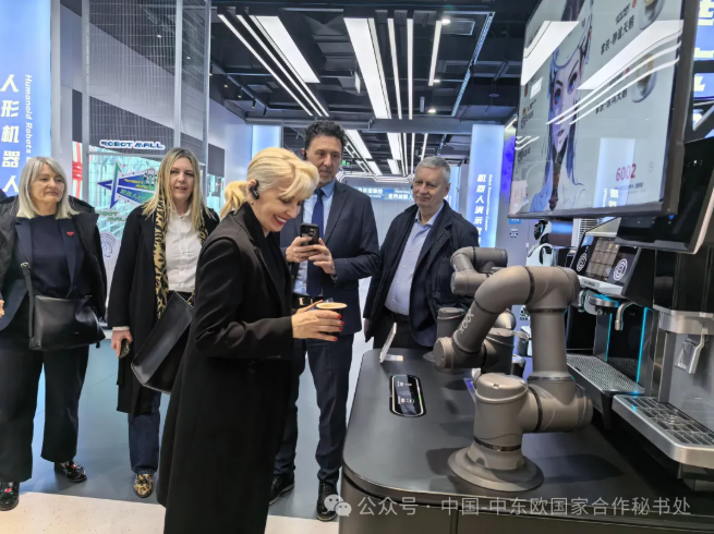 在北京亦庄机器人大世界,从机器人舞蹈秀到能做手术的精密机械臂,从智能机器狗灵活翻跟头到与爱因斯坦、李白人形机器人跨时空对话,代表团与机器人欢乐互动,直观感受中国人工智能和仿生技术。机器人咖啡师现场展示拉花技艺,代表团成员品尝后赞不绝口。