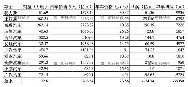 理想和蔚来的单车价格也较高,均超过25万元。不过,两家车企的单车盈利水平存在差异。蔚来按照Non-GAAP利润计算,单车亏损约3.8万元,虽然亏损额较之前已大幅收窄,理想的单车利润则为5857元。
