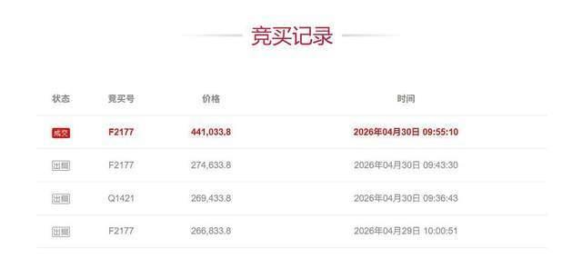 此次竞拍只吸引了两人参与。竞买号F2177于4月29日10时以起拍价竞拍,另一竞买号Q1421随后加价竞拍,但F2177连续两次加价,最终以441033.8元的价格成功拍下尾号“9999999”的手机号,最终成交价比起拍价高出了17.42万元。
