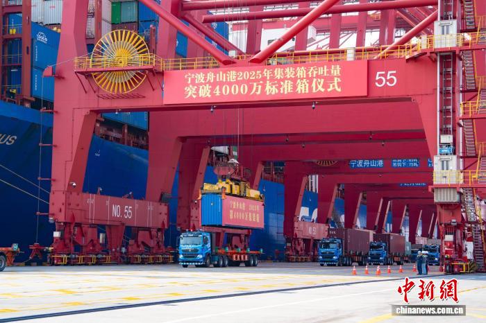中新社宁波12月2日电(奚金燕)12月2日,在桥吊司机远程操控下,一个满载货物的集装箱稳稳落在“中远海运人马座”轮,标志着宁波舟山港年集装箱吞吐量首次突破4000万标准箱。