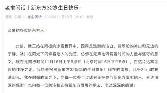 11月16日,新东方迎来32周年纪念日,创始人俞敏洪身处南极向全体员工发出一封全员信。这封本是庆祝公司生日、激励员工的公开信却引发诸多争议。有网友认为,作为老板,少点鸡汤,多点实际行动,给员工加薪才是最好的激励