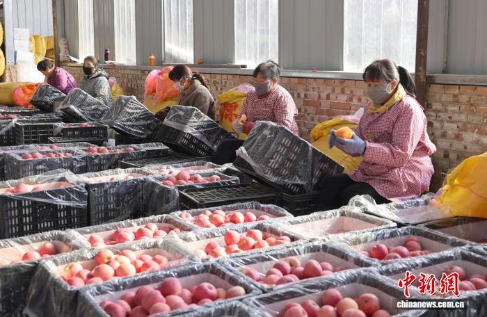 中新网兰州3月11日电 (盘小美)3月中旬的黄土高原,春寒料峭。清晨,甘肃省庆阳市西峰区温泉镇米堡村庆阳汇果塬果蔬有限责任公司的果库里,几十名工人有条不紊地开展苹果分拣、打包、装运等作业,一箱箱苹果已经码放整