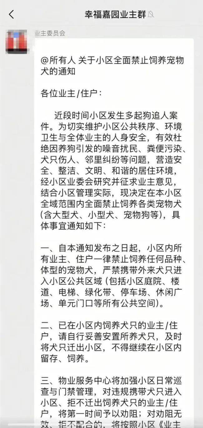 近日,有网友发帖称,广西南宁黎塘镇幸福嘉园小区业委会发布通知,全面禁止饲养宠物犬。通知提到小区近期发生多起狗追人事件,因此禁止外界犬只进入小区,小区内已有犬只需迁出小区,不得在小区内留存、饲养