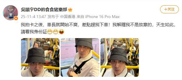 11月4日,吴镇宇在社交平台上分享了一段经历。他在使用公交老年卡时,因外貌显年轻被车长质疑“冒用他人证件”,甚至险些被赶下车