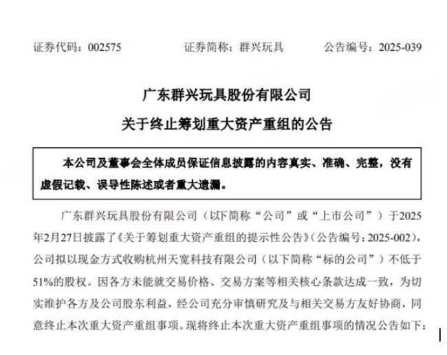 群兴玩具(002575.SZ)第五次追“风口”再败,拟现金收购天宽科技51%股权因价格谈崩终止。