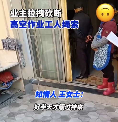 11月20日,四川广安。拍摄者王女士称,他们工人在16楼往下放绳子准备高空作业时,忽然绳子被从下面拉扯,差点把人拉了下去,师傅吓了好半天才反应过来,下去查看发现绳子呈绷紧状态,原来是3楼的业主不满绳子从自家露台经过,便伸手拉拽,并且砍断了...